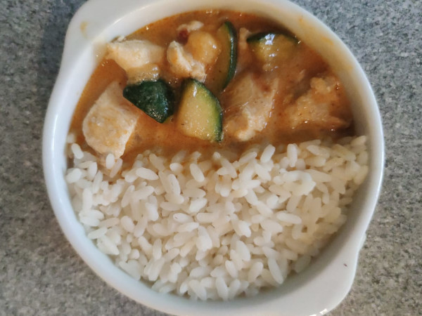 Zutaten: Huhn, Reis, Zwiebel, Zucchini, Kokosmilch, Gewürze.