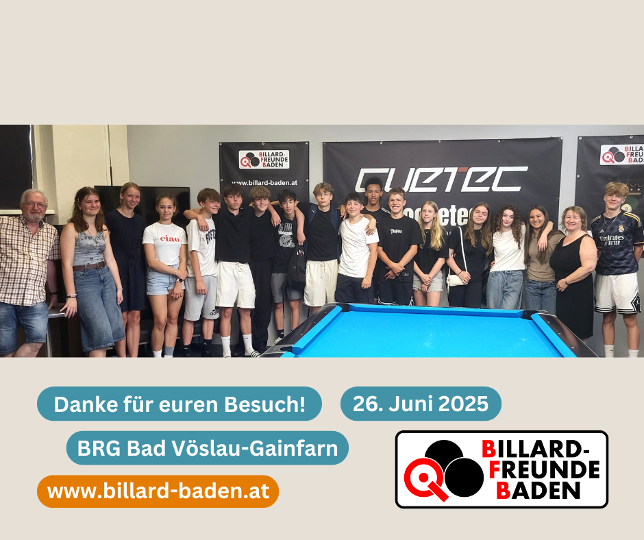 Meldungen Schülergruppe des BRG Bad Vöslau-Gainfarn 26. Juni 202510. August 2025 Poolbillard statt Schule! – Ende Juni besuchten uns Angelika und Claus Mantler mit ihrer 16-köpfigen Schülergruppe des BRG Bad-Vöslau-Gainfarn im Billardquartier Baden. – Danke für euren Besuch!